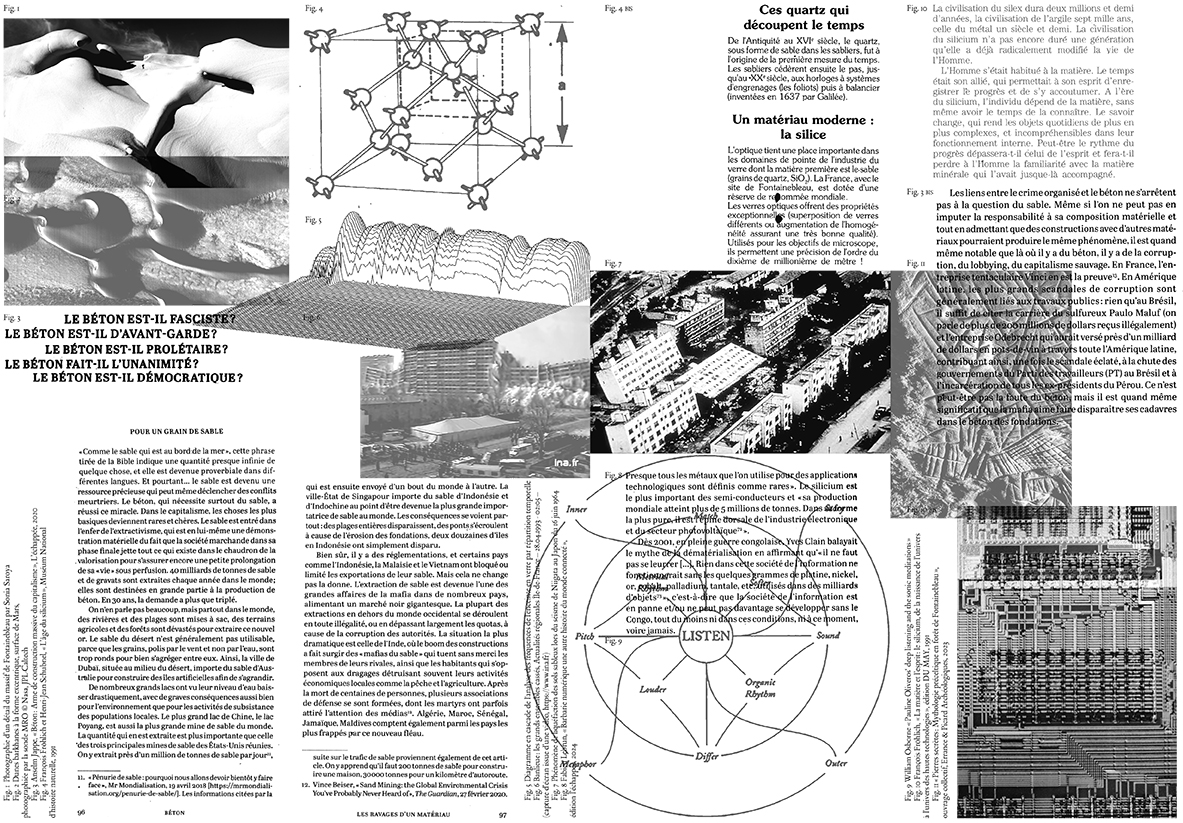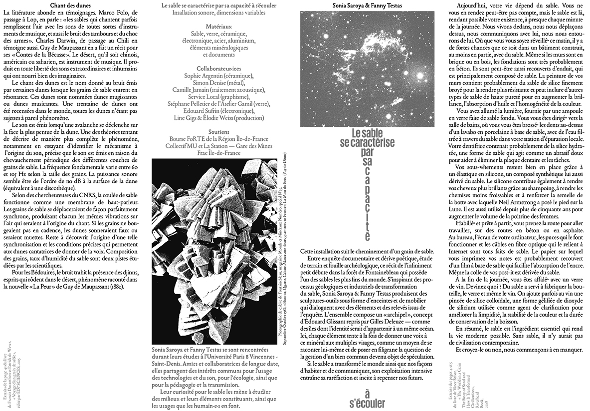 L’installation Le sable se caractérise par sa capacité à s’écouler suit le cheminement d’un grain de sable. Entre enquête documentaire et dérive poétique, étude de terrain et fouille archéologique, ce récit de l’infi niment petit débute dans la forêt de Fontainebleau qui possède l’un des sables les plus fi ns du monde. S'inspirant des processus géologiques et industriels de transformation du sable, les artistes produisent des sculptures-outils sous forme d’enceintes et de mobilier qui dialoguent avec des éléments et des relevés issus de l’enquête. Ici, chaque élément tente à la fois de donner une voix à ce minéral aux multiples visages, comme un moyen de se raconter lui-même et de poser en fi ligrane la question de la gestion d’un bien commun devenu objet de spéculation. S’il a transformé le monde ainsi que nos façons d’habiter et de communiquer, son exploitation intensive entraîne sa raréfaction et incite à repenser nos futurs.